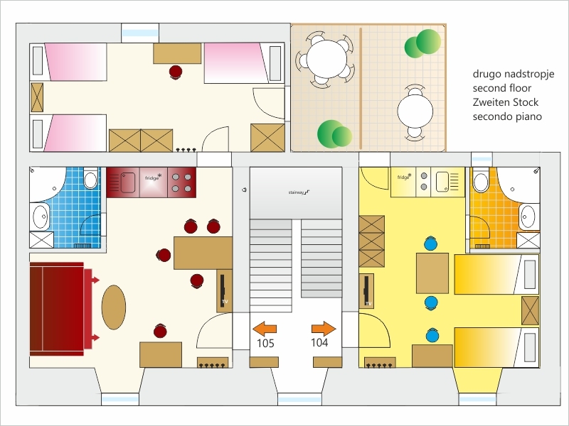 3–4 personssecond floor, one room, 1 bedroom with 3 beds, living room with kitchen and a sleeper sofa for 1 person, bathroom with shower, air conditioning, cable TV, internet, completely furnished, terrace.